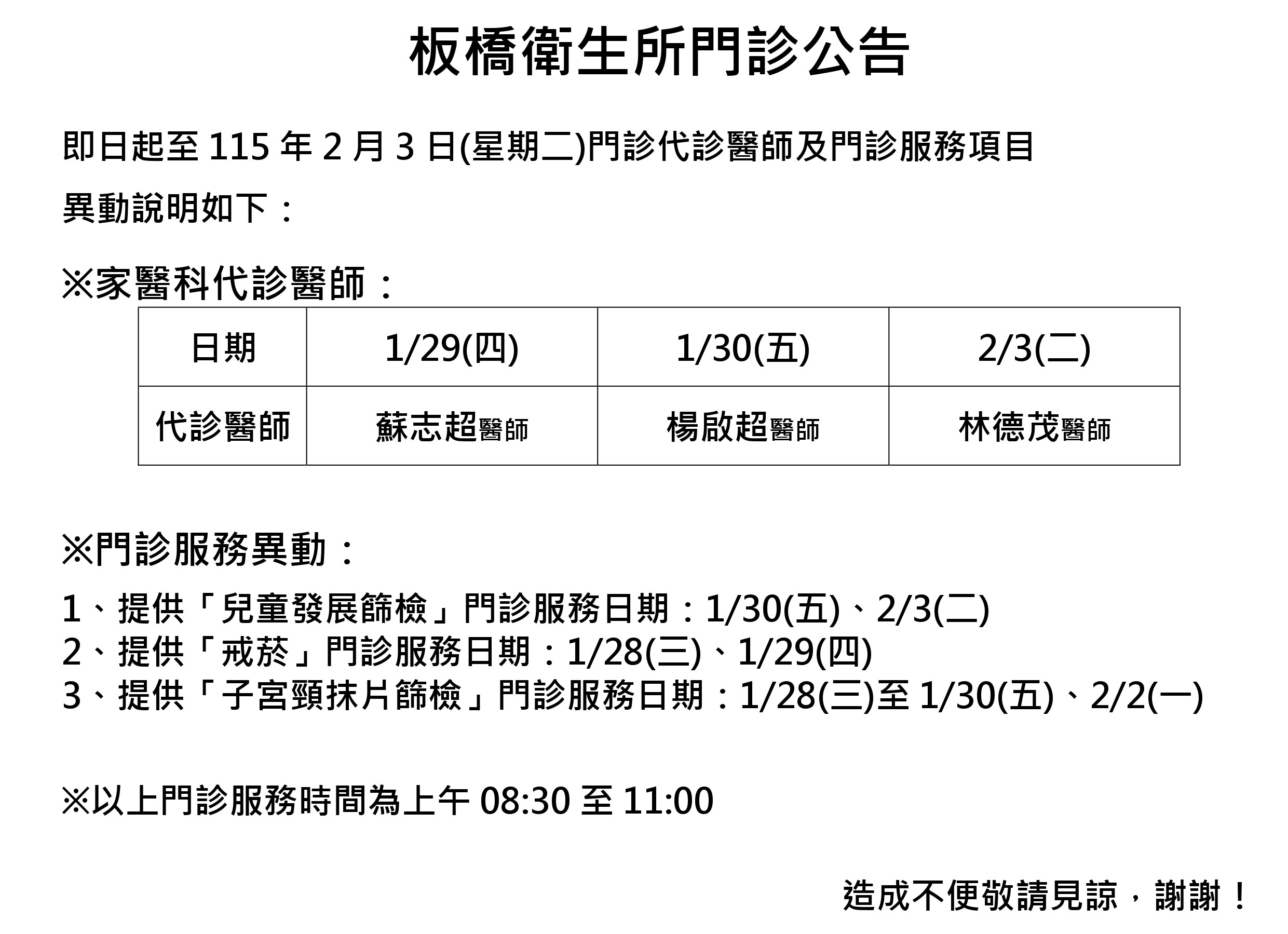 即日起至115年2月3日(星期二)門診代診醫師及門診服務項目異動公告