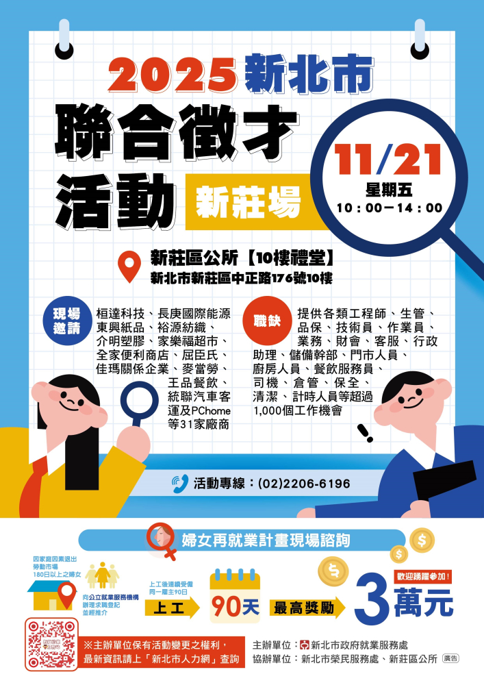 新北市政府就業服務處於11月21日(星期五)上午10點至下午2點在新莊區公所10樓大禮堂,舉辦「2025新北市聯合徵才活動」,邀請31家廠商,提供超過1,000個工作機會,